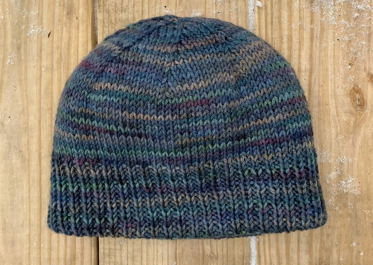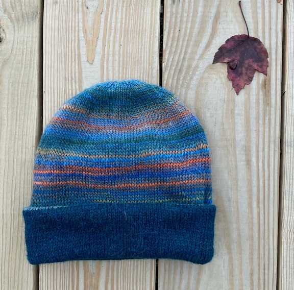 Version 1: Knit with Mille Colori Baby and Nord yarns, this reversible hat is soft and snug. Knit with a reversible brim or not. Started with 8 stitches and finished down to 4 stitches. Uses #3 needles. 18.5”, 20”, 21”, 23" Knitting gauge: